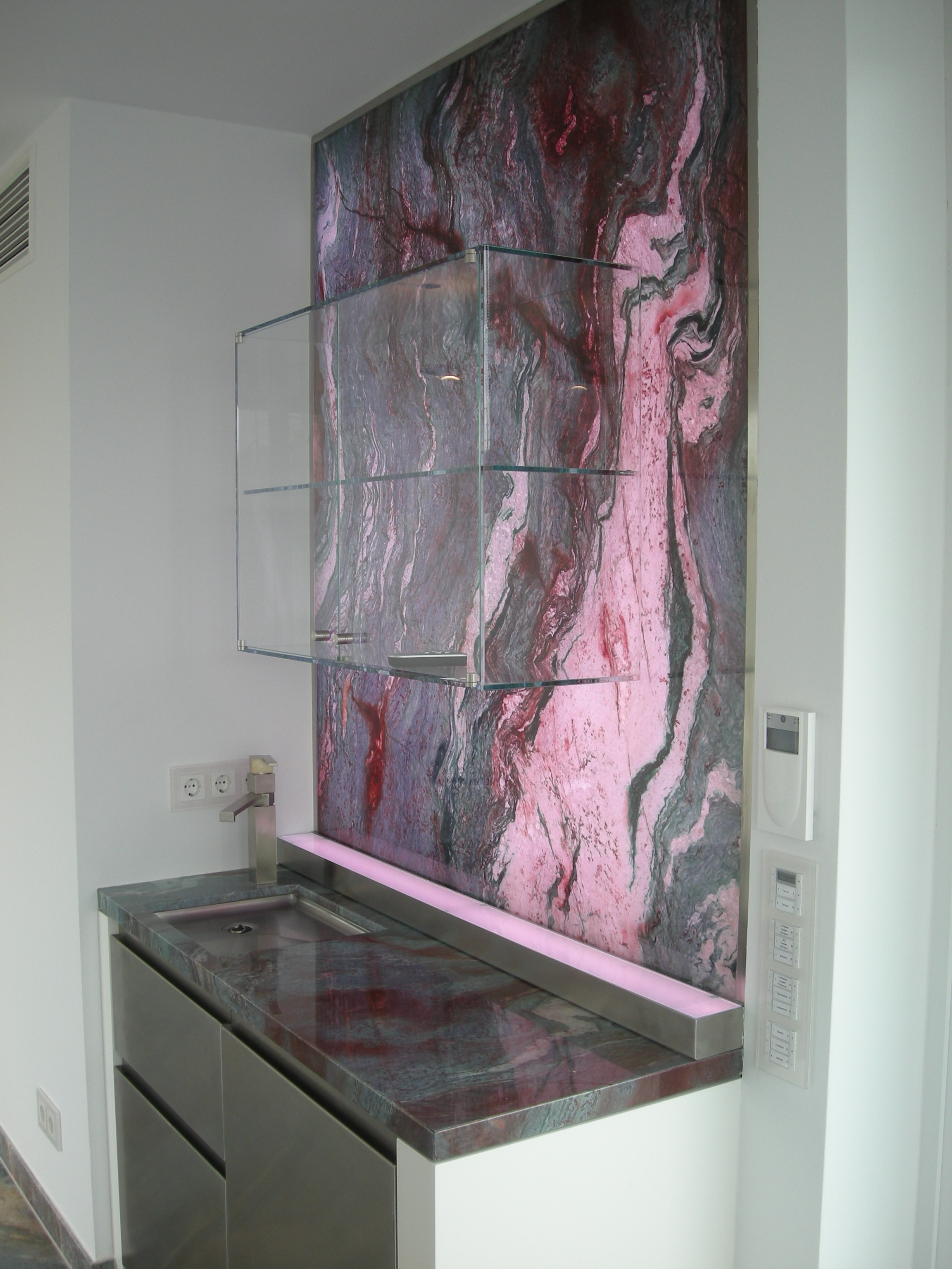 Im Möbelbau ist Glas ein altbewährtes Material. Es können alle Methoden der Glasveredelung zum Tragen kommen: mattieren, emaillieren, verspiegeln, bedrucken uvm. und die Verklebung mit UV-härtenden Klebstoffen garantiert eine saubere, unsichtbare Verklebung.